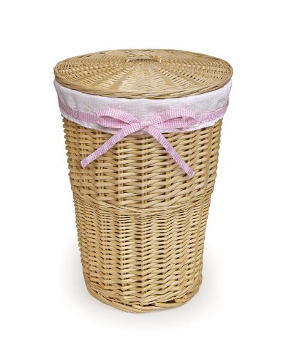This Hamper offers the beauty of wicker with the convenience of a liner! Removable liner makes it easy to empty the hamper on wash day. Features: Hamper includes: one basket, one liner, one pink gingham ribbon, one blue gingham ribbon, one sage gingham ribbon, and one white waffle ribbon. Change the look of your nursery in an instant! Mix and match the ribbons to match your decor, or don't use any of the ribbons at all! The choice is yours! Generously sized liner lines the full interior of the hamper. The lid has a handle so it's easy to open and close. Lip on the bottom of the lid keeps it in place so the lid can't be easily knocked off. Lid completely removes if you don't want to use it. Slots on the sides of the hamper provide useful hand grips so you can easily carry it to the laundry room. Hamper measures 16" round by 22" tall. Fabric is a poly,cotton blend and can be machine washed.