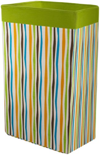 Z23HAM Conceal laundry or toys in this lightweight Zutano Elephant hamper featuring dizzy stripes in lime green, team and brown topped with a lime green band at the top. Features: -Elephants collection. -Includes side handles for quick trips to the laundry room. -Hamper folds completely flat for easy storage when not in use. -Coordinates with Zutano Elephants crib set. -Measures 14" x 13" x 25".